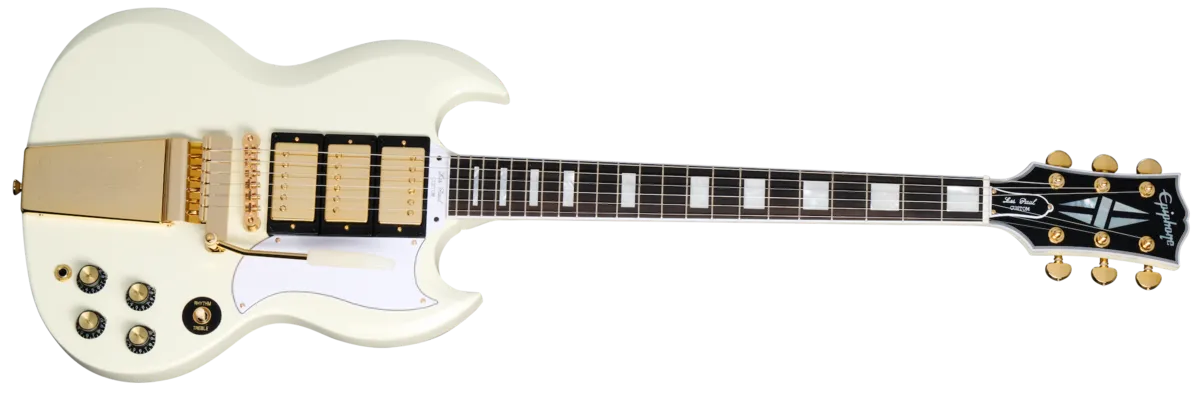 The Epiphone Emily Wolfe "White Wolfe" Sheraton is based on the triple-threat rock & roll singer, songwriter, and guitarist's popular Sheraton Stealth. Once again, Emily has lent her creativity to develop her new artist model. The Emily Wolfe "White Wolfe" Sheraton is equipped with an Indian laurel fretboard with 22 medium jumbo frets and mother of pearl block inlays with abalone lightning bolts. The headstock has a mother of pearl tree of life of inlay on the front, Emily's Wolfe logo and a white gloss Emily Wolfe signature on the rear, and is outfitted with Grover® Rotomatic® tuning machines and a Graph Tech® nut. An Epiphone LockTone™ Tune-O-Matic™ bridge and Stop Bar tailpiece hold down the other end of the strings and contribute (O the impressive sustain of the instrument. The electronics include full-sized Epiphone Alnico Classic PRO™ humbucker ™ pickups paired with CTS® potentiometers for smooth control over individual pickup volume and overall tone. It's finished in Aged Bone White paired with lightly aged gold hardware. An EpiLite™A case is included.