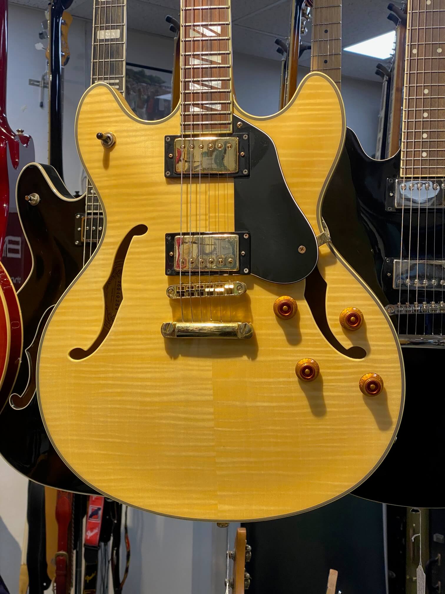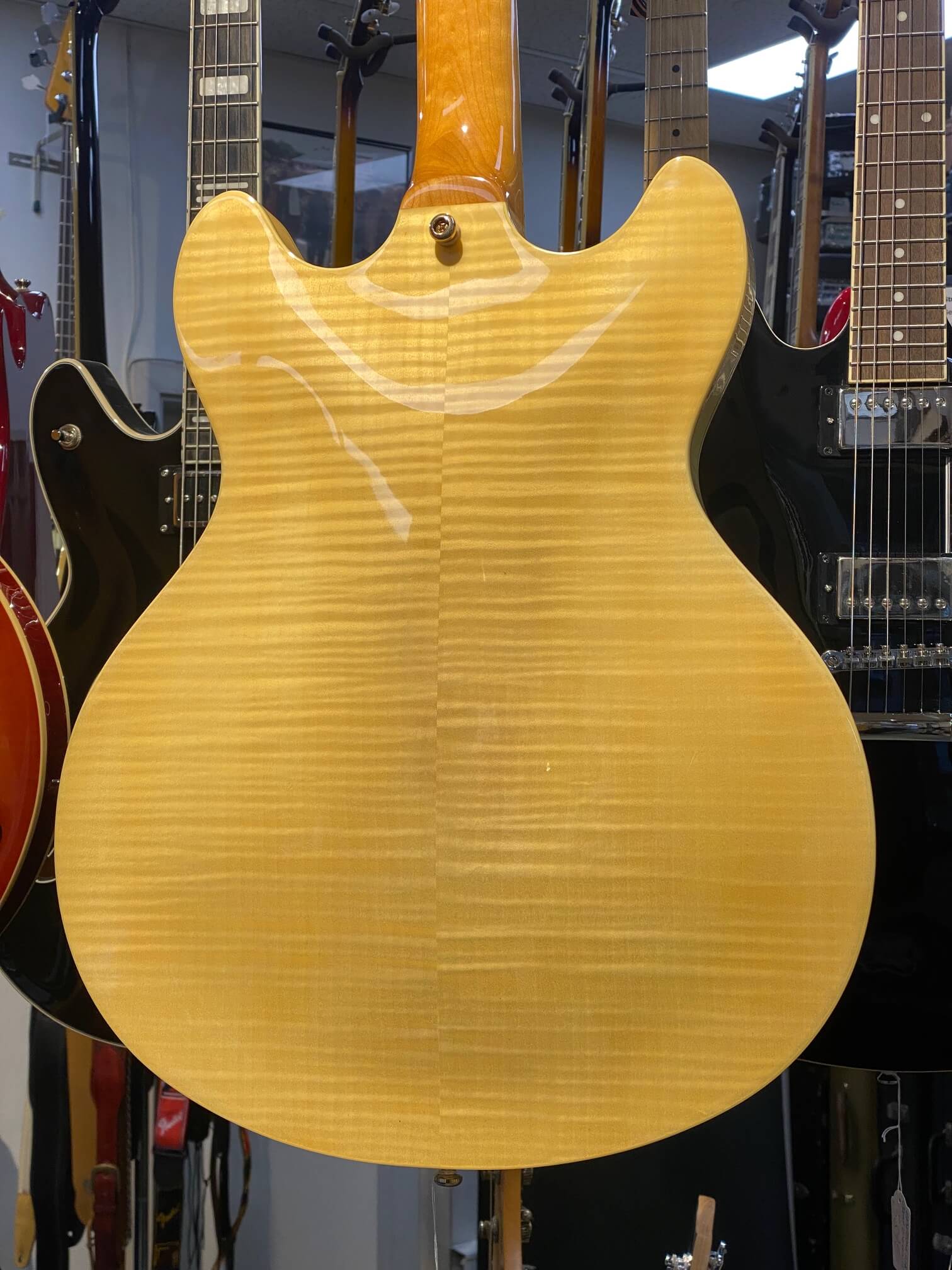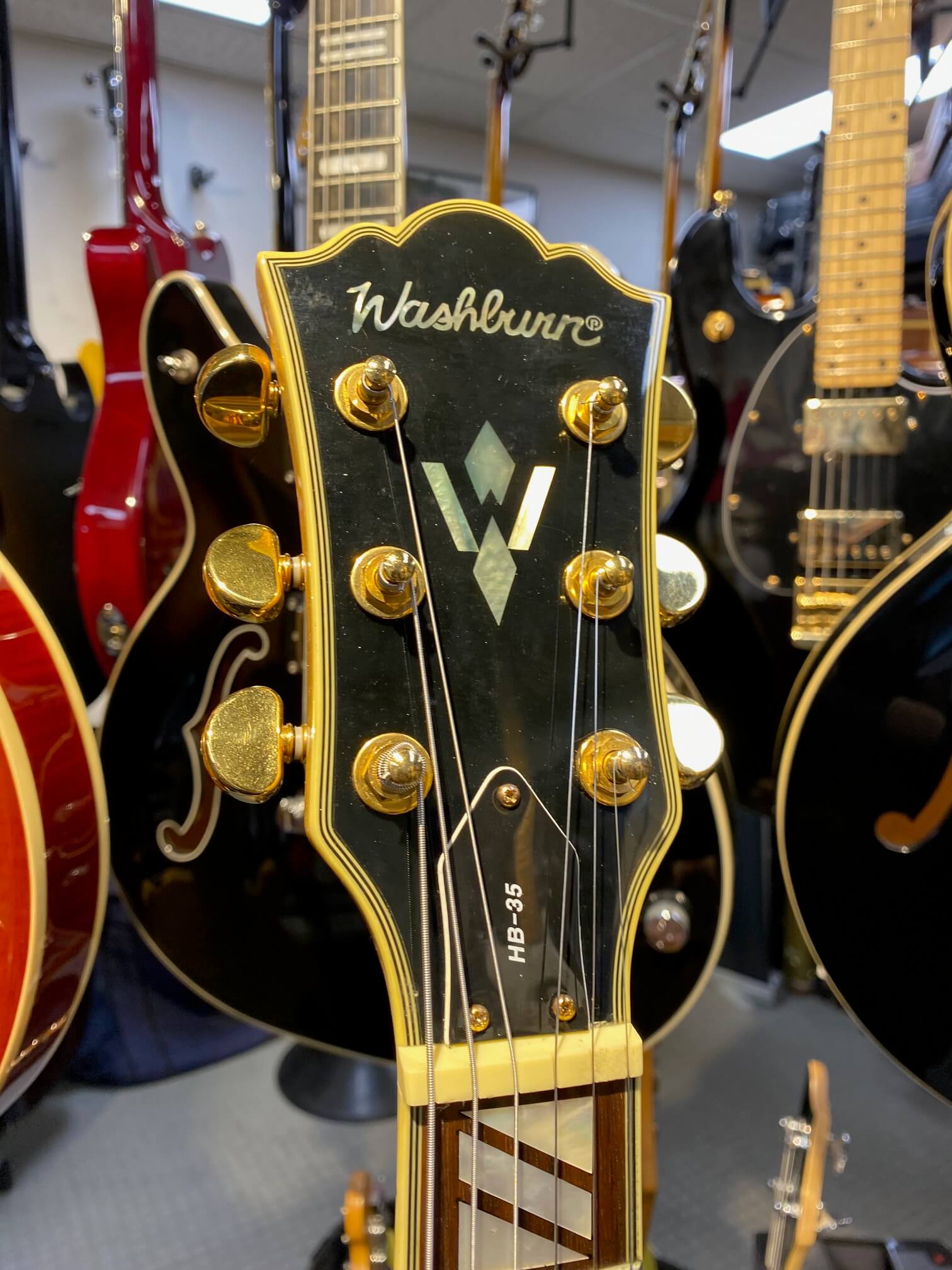 Washburn HB35TS Hollow Body Elektrisk Guitar er fantastisk for spillere, jazz, blues og rock. Den Hollow Body er typisk lettere og mere resonant end deres solide krop counter dele, giver det en tage tone. Denne guitar har en stilfuld Natur glans finish med guld hardware, en skrap ahorn hals med en 22-fret Rosewood gribebræt, samt dobbelt Washburn humbuckers og Grover eksklusive 18:1 guld tunere. HB35 også udstyret med en dobbelt cutaway og inkluderer en massiv ahorn blok i midten, øge sustain og reducere modtageligheden for feedback i høj lydstyrke situationer.